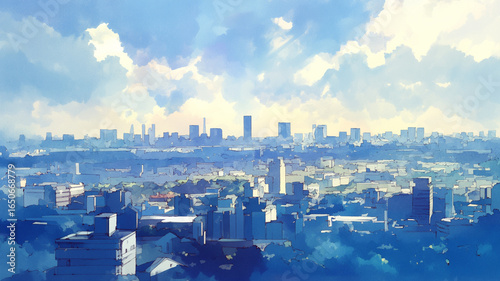 Obraz premium 広がる青空と太陽の光に照らされた大都市の景色を水彩画タッチで表現した幻想的なイラスト。透明感と柔らかさを兼ね備えたパノラマビューが印象的なアート背景デザイン。