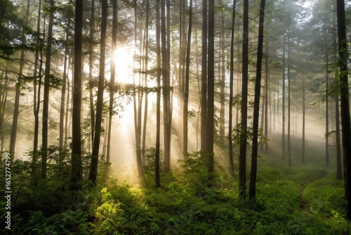 © sky studio, Naklejka premium 森, 木, 自然, かすみ, 当惑, 風景, 太陽, 霧の, 光, 秋, 緑, パス, 太陽光, モーニング,