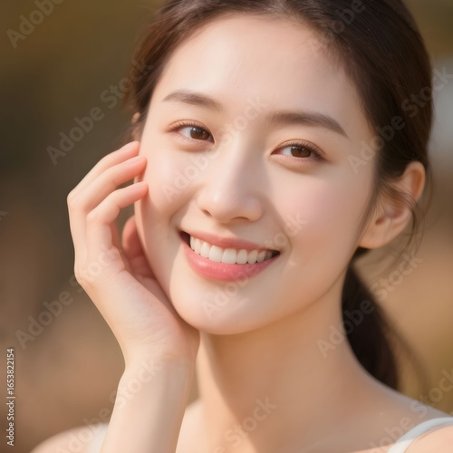 © 지향 오, Fototapeta premium 자연스러운미소의젊은여성클로즈업포트레이트