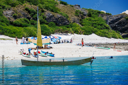 © d3_plus, Fototapeta premium 無人島の嘉比島が見える。 白砂のビーチには観光客が上陸している。 パラソルやボート、サバニ(沖縄特有の双胴船)も見える。 船上からも水底の様子が見える。 素晴らしい透明度。 沖縄県島尻郡慶良間諸島座間味島嘉比島-2025/6/27