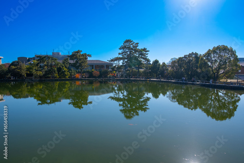 Obraz premium 奈良、奈良公園、紅葉、五重塔、歷史名勝、水、池塘、木、綠色、青空、秋、絶景、写真素材