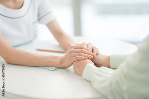 © lielos, Obraz premium エステティシャン/セラピスト。彼女はカウンセリング相手の手に両手を重ねて親身になり話を聞いている。