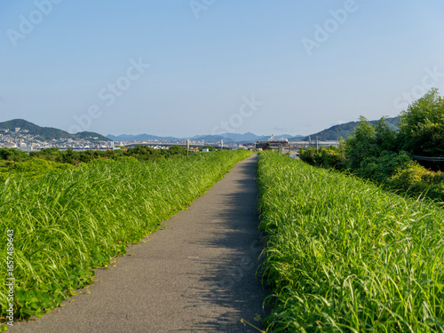 Obraz premium 新緑の植物が伸びる猪名川の堤防道路
