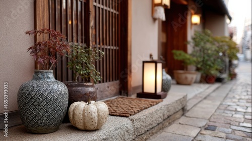 © Antonster, Fototapeta premium 秋の夜に訪れる和風のハロウィン、静かな通りに並ぶランタンとカボチャ