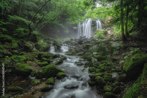 Obraz premium 新緑の木の俣渓谷