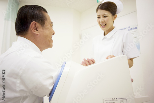 © Paylessimages, Obraz premium 血圧を測る男性患者に話し掛ける看護師