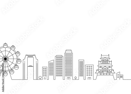 Obraz premium 大阪城と観覧車が並ぶ大阪の街並み線画イラスト