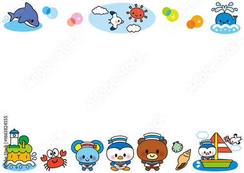 Fototapeta premium 海,夏,フレーム,動物,水族館,子供,幼稚園,保育園,8月,ヨット,ペンギン,ネズミ,クマ,魚,イルカ,クジラ,カモメ,カニ,乗り物,保育,幼児,メッセー...