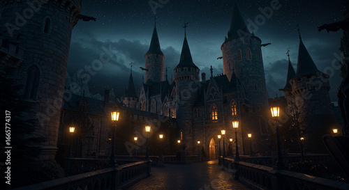 © nao, Obraz premium ダークファンタジー城の夜景 背景イラスト