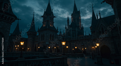 © nao, Obraz premium ダークファンタジー城の夜景 背景イラスト
