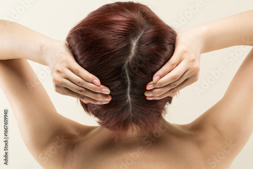 © kei907, Fototapeta premium 若いアジア人の女性の頭皮のクローズアップ。