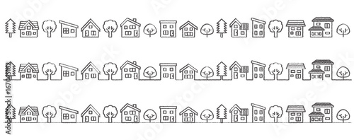Obraz premium デフォルメした家と木の並び(線画手書き風)