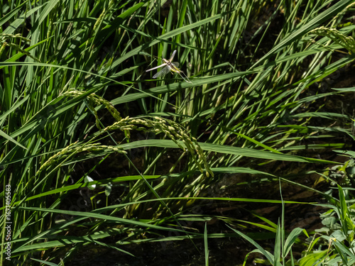 Obraz premium 田んぼの稲の上を飛ぶバッタ