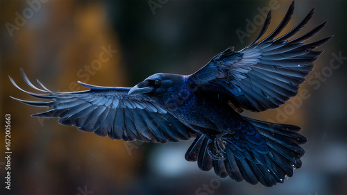 Obraz premium 琥珀の光に縁取られた黒いカラスの舞い