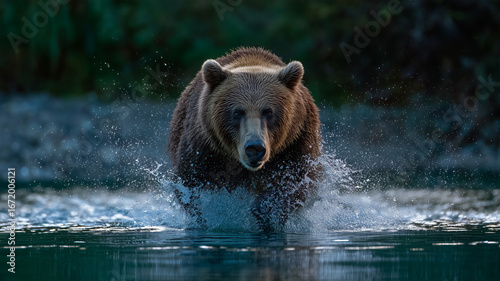 Obraz premium オーロラの下で月夜の川でサケを捕らえるヒグマ