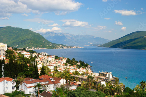 Obraz premium Вид на город Херцег-Нови, Боко-которский залив и окружающие его горы, Черногория