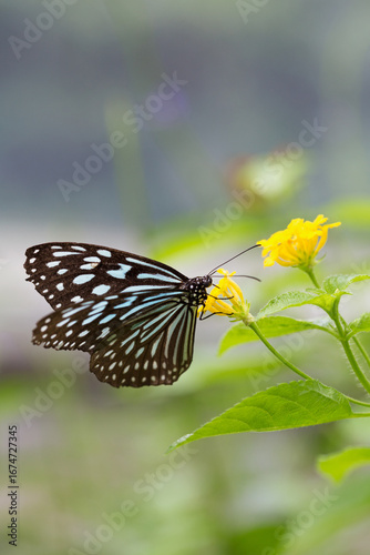 Obraz premium 黄色い花に止まるリュウキュウアサギマダラ