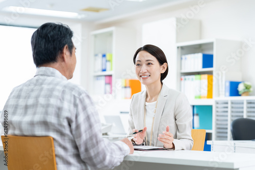 Fototapeta premium シニアの男性に営業するミドルのビジネスウーマン,ビジネス
