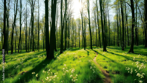Obraz premium 春の穏やかな太陽の光が降り注ぐ森