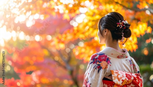 Fototapeta premium 鮮やかな紅葉を眺める晴れ着姿の女性の後ろ姿のポートレート