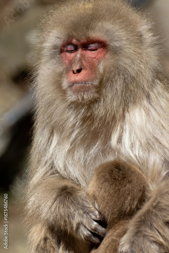 Naklejka premium 子供を抱えながら目を細めているニホンザルの母親