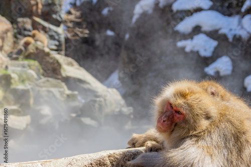 Obraz premium 湯気の上がっている温泉の横にいるニホンザル