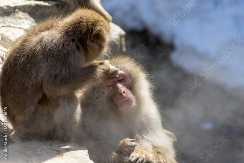 Obraz premium 湯煙の中で毛繕いをしている2頭のニホンザル