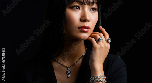 © JIN, Obraz premium 黒バックでジュエリーを付けた女性の手のポーズ