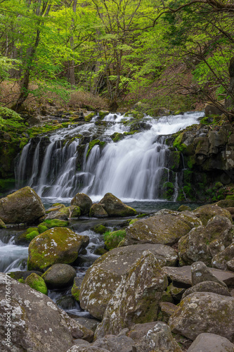 Obraz premium 新緑に囲まれた蓼科大滝と滝ノ湯川の流れ