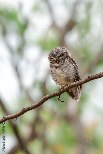Obraz premium タイなど、東南アジアの公園や森林で見られる水玉模様をした小さなフクロウの仲間、インドコキンメフクロウ