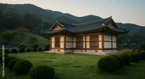 © iron89, Obraz premium 자연을 담은 한옥집. 산 중턱에 자리한 아름다운 한옥집.