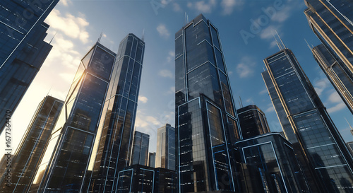 Obraz premium 近未来的なガラス張りの高層ビル群と青空の都市風景