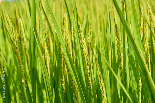 Naklejka premium 稲穂に花が咲く頃の田んぼの風景。8月下旬の水田