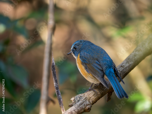 Fototapeta premium 森の深い藪の奥で静かに周りを見渡しているルリビタキの雄