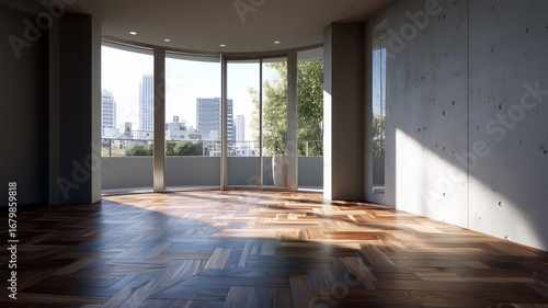 Obraz premium コンクリ壁と濃色床の静かな室内空間と都市眺望