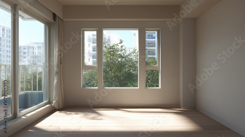 © bephoto, Obraz premium リネン壁と淡色床の落ち着いた日当たり良い室内