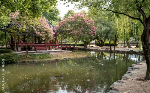 © sephoto, Fototapeta premium 비가 내리는 흐린 날 빗줄기 사이로 보는 남원 광한루 풍경