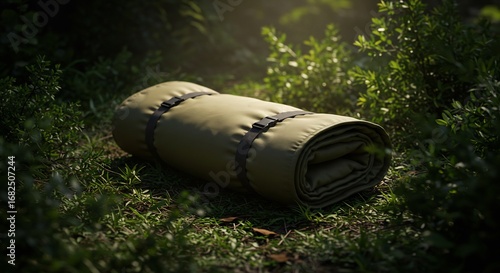 Fototapeta premium 緑の森に置かれた折り畳み式キャンプ用マットレス写真 自然光と影の描写