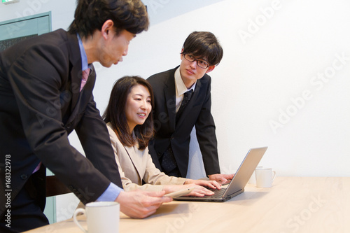 Fototapeta premium ノートパソコンの画面を見て計画を話し合う3名のビジネスパーソン