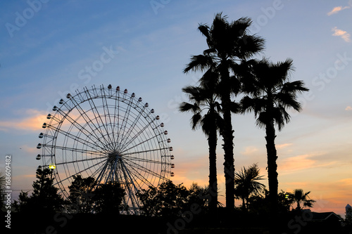 © RyoAnna, Fototapeta premium 夕方の観覧車とヤシの木