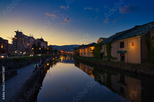 Naklejka premium 夕暮れ時の小樽運河、ノスタルジックな街並みと水面に映る灯り