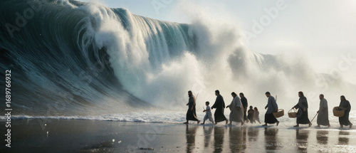 © MEO, Obraz premium 거대한 파도 앞을 걷는 고대 군중의 성경 일러스트