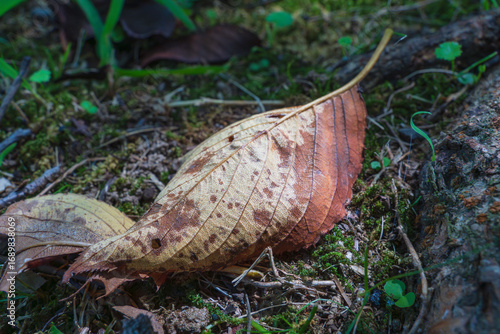 Obraz premium 秋の森 紅葉した落ち葉に日差しが差し込む05