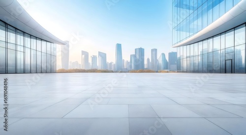 © KidJpeg, Fototapeta premium 青い空の下の現代的な都市景観 ビルが立ち並び 明るい光の中で反射するガラス構造