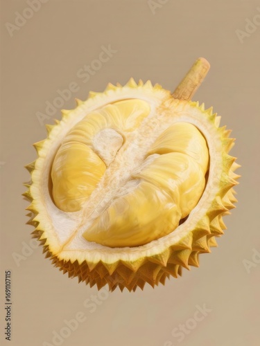 © Kagezt2, Obraz premium ハーフカットされたとげとげのドリアンは、淡いアプリコット色の背景に黄色がかった白い果肉を見せています