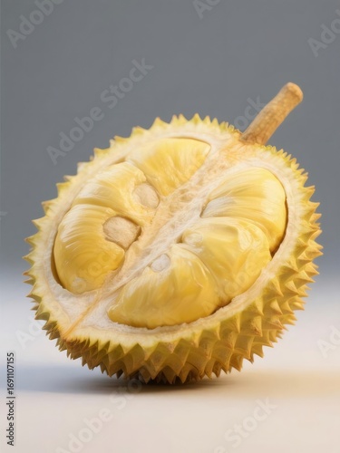 © Kagezt2, Obraz premium カットされたドリアン果実 クリーミーな黄色の果肉と質感のある棘の殻 グレーがかった背景