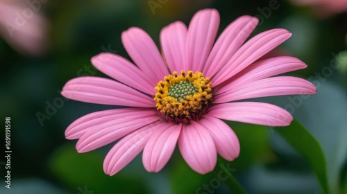 Obraz premium 鮮やかなピンク色のデイジーの花 黄色と緑のディテールでフォーカスされたマクロ撮影 自然の美しさ