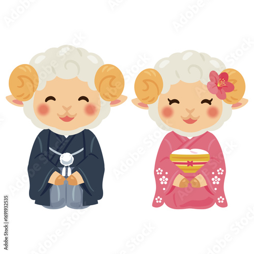 Fototapeta premium 晴れ姿で笑顔な未年のキャラクター 男女