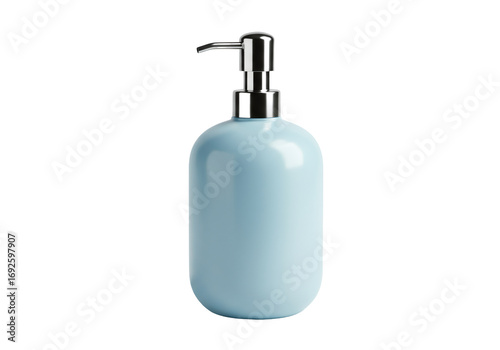 © 小さな花, Fototapeta premium 青色のセラミック液体ソープディスペンサーのクローズアップ透明背景に分離されたシンプルなデザイン