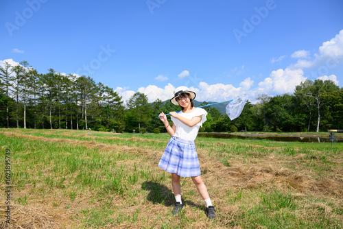 Obraz premium 青空の下で虫取りを楽しむ女の子